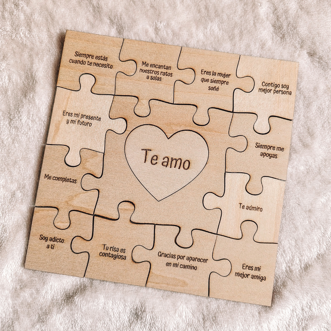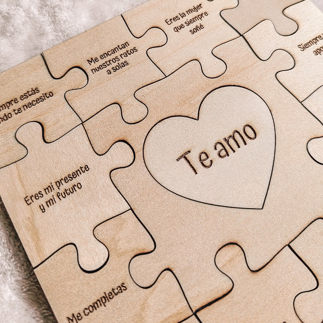 ¿Buscas una forma diferente de decirle todo lo que sientes?. Este puzle de madera no es para jugar, es para emocionar. Cada pieza lleva un mensaje grabado que explica por qué sois el equipo perfecto. Dedicatorias cortas y llenas de cariño que forman vuestra historia.
