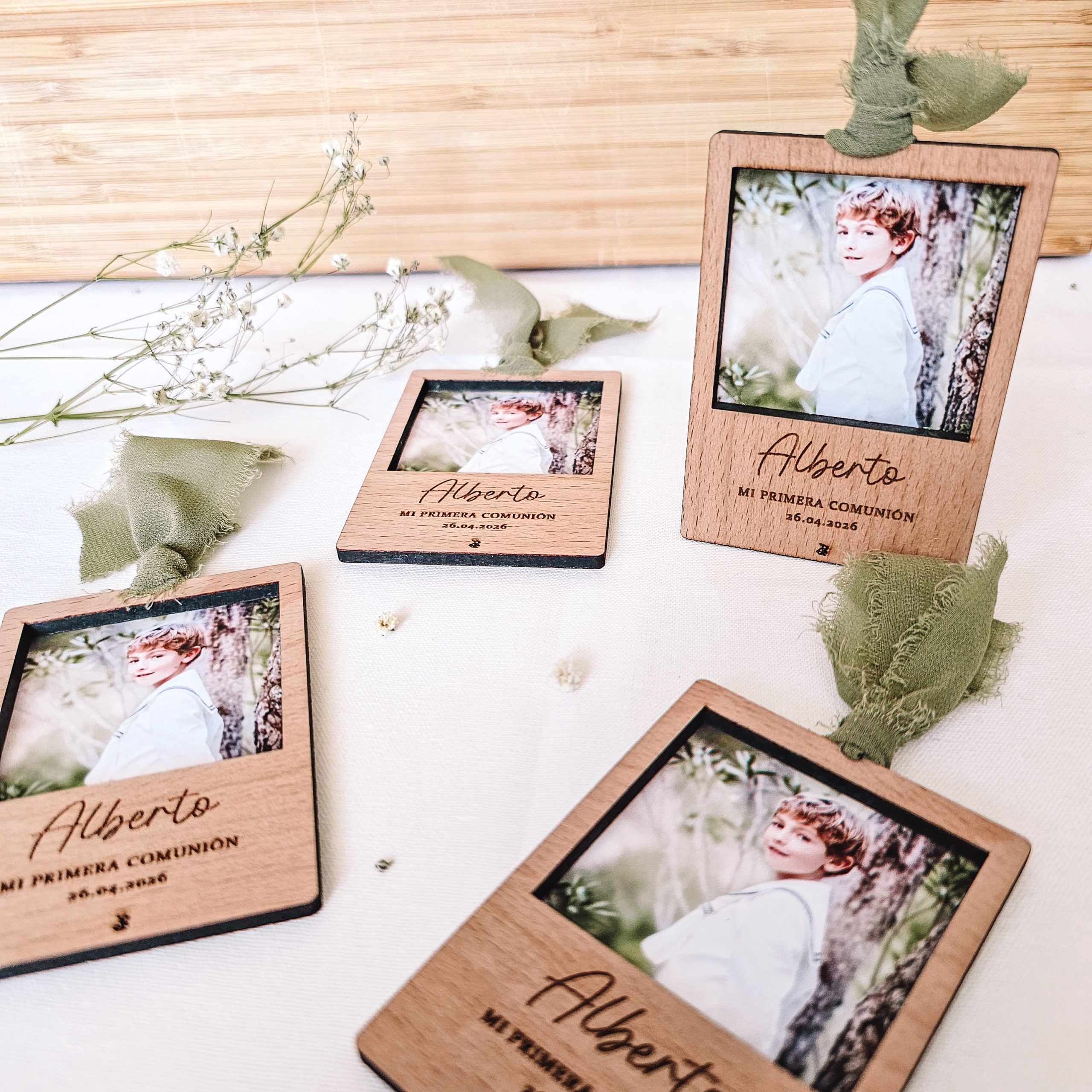 Un detalle pensado para que tus invitados conserven un recuerdo vivo de un día tan especial. Este recordatorio une la calidez de la madera con la fotografía de tu hijo o hija, convirtiéndose en un objeto decorativo que familia y amigos querrán lucir en cualquier rincón de casa.